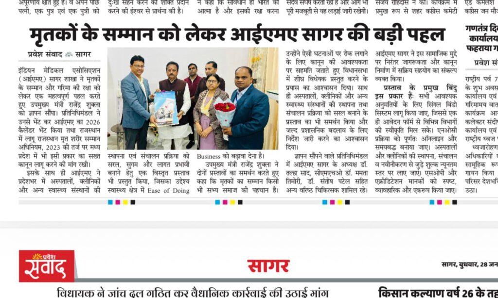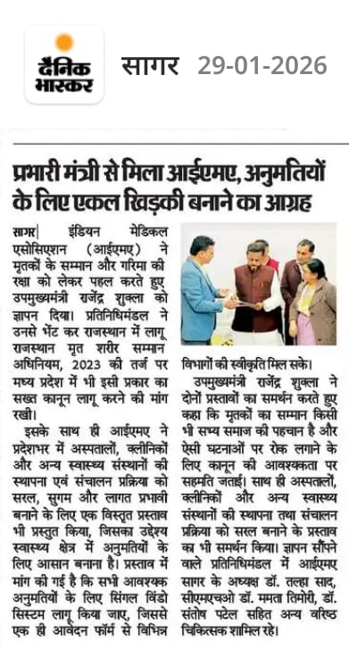 इंडियन मेडिकल एसोसिएशन (आईएमए) सागर शाखा ने मृतकों के सम्मान और गरिमा की रक्षा को लेकर एक महत्वपूर्ण पहल करते हुए उपमुख्य मंत्री श्री राजेंद्र शुक्ला को ज्ञापन सौंपा। प्रतिनिधिमंडल ने उनसे भेंट कर आईएमए का 2026 कैलेंडर भेंट किया तथा राजस्थान में लागू राजस्थान मृत शरीर सम्मान अधिनियम, 2023 की तर्ज पर मध्य प्रदेश में भी इसी प्रकार का सख्त कानून लागू करने की मांग रखी।इसके साथ ही आईएमए ने प्रदेशभर में अस्पतालों, क्लीनिकों और अन्य स्वास्थ्य संस्थानों की स्थापना एवं संचालन प्रक्रिया को सरल, सुगम और लागत प्रभावी बनाने हेतु एक विस्तृत प्रस्ताव भी प्रस्तुत किया, जिसका उद्देश्य स्वास्थ्य क्षेत्र में Ease of Doing Business को बढ़ावा देना है।