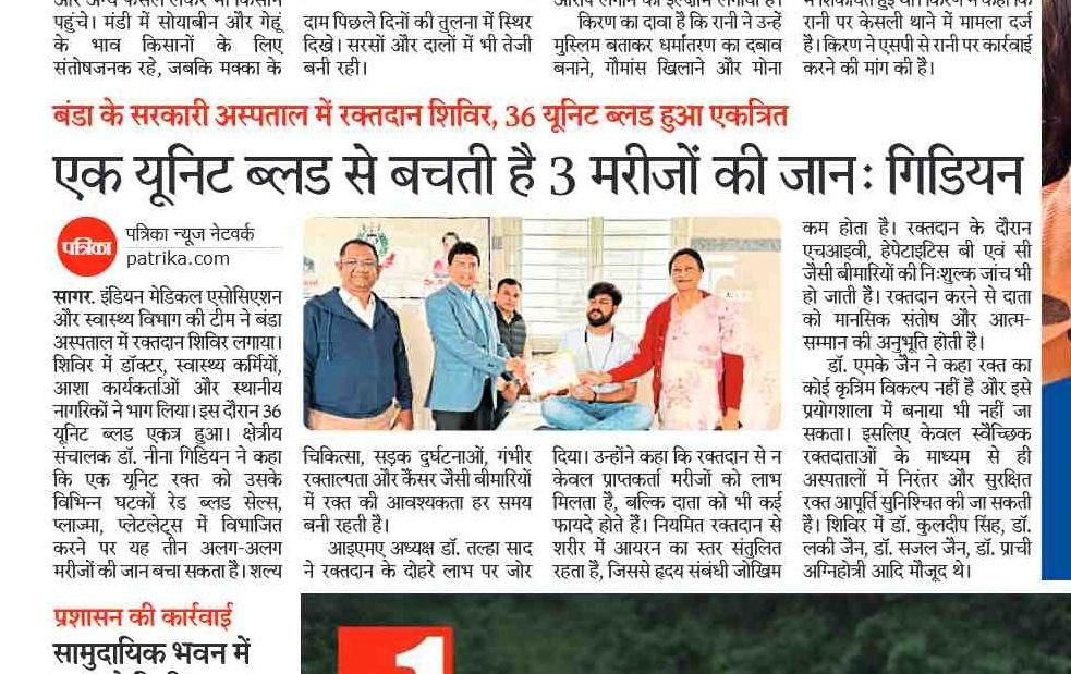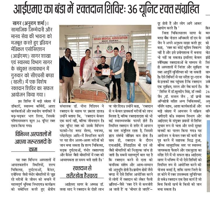 सागर, 29 जनवरी 2026 – सामाजिक जिम्मेदारी और मानव सेवा की भावना को मजबूत करते हुए इंडियन मेडिकल एसोसिएशन (आईएमए) सागर शाखा एवं स्वास्थ्य विभाग सागर के संयुक्त तत्वावधान में आज सीएचसी बण्डा (रहली) में एक विशेष रक्तदान शिविर का सफल आयोजन किया गया। इस शिविर में बड़ी संख्या में डॉक्टरों, स्वास्थ्य कर्मियों, आशा कार्यकर्ताओं और स्थानीय नागरिकों ने बढ़-चढ़कर भाग लिया, जिसके परिणामस्वरूप कुल 36 यूनिट रक्त एकत्र किया गया। यह रक्त विभिन्न अस्पतालों में आपातकालीन स्थितियों, शल्य चिकित्सा, दुर्घटनाओं, कैंसर, एनीमिया जैसी गंभीर बीमारियों से जूझ रहे मरीजों के जीवन को बचाने में महत्वपूर्ण भूमिका निभाएगा।