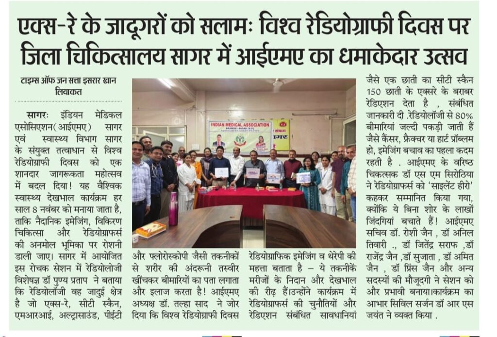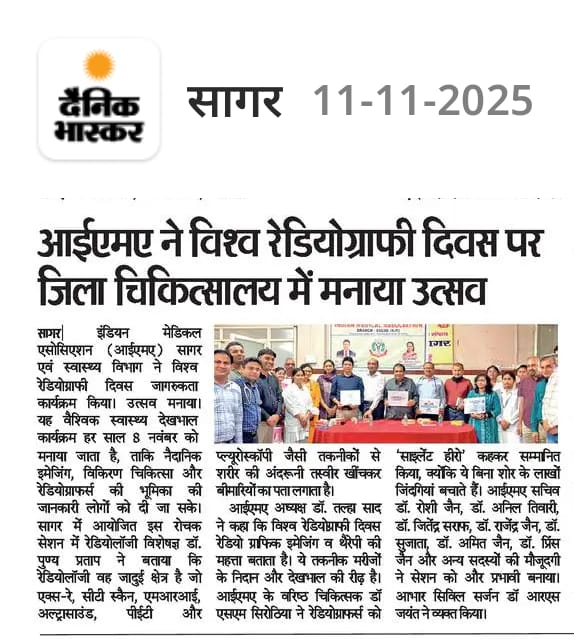 सागर, 8 नवंबर 2025 – इंडियन मेडिकल एसोसिएशन(आईएमए) सागर एवं स्वास्थ्य विभाग सागर के संयुक्त तत्वाधान से विश्व रेडियोग्राफी दिवस को एक शानदार जागरूकता महोत्सव में बदल दिया! यह वैश्विक स्वास्थ्य देखभाल कार्यक्रम हर साल 8 नवंबर को मनाया जाता है, ताकि नैदानिक इमेजिंग, विकिरण चिकित्सा और रेडियोग्राफर्स की अनमोल भूमिका पर रोशनी डाली जाए। सागर में आयोजित इस रोचक सेशन में रेडियोलोजी विशेषज्ञ डॉ पुण्य प्रताप ने बताया कि रेडियोलॉजी वह जादुई क्षेत्र है जो एक्स-रे, सीटी स्कैन, एमआरआई, अल्ट्रासाउंड, पीईटी और फ्लोरोस्कोपी जैसी तकनीकों से शरीर की अंदरूनी तस्वीर खींचकर बीमारियों का पता लगाता और इलाज करता है!