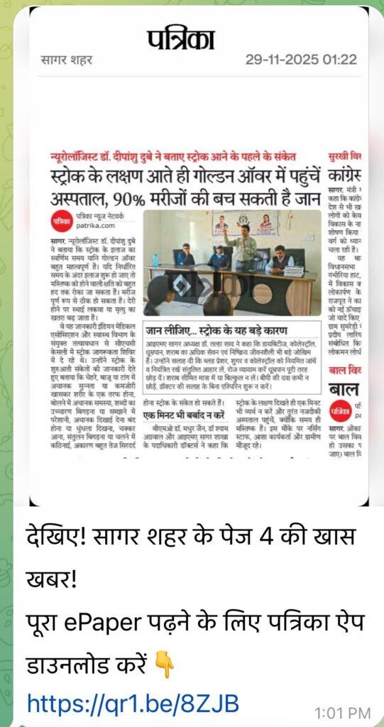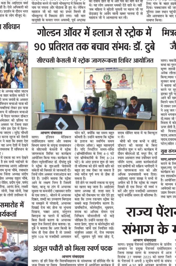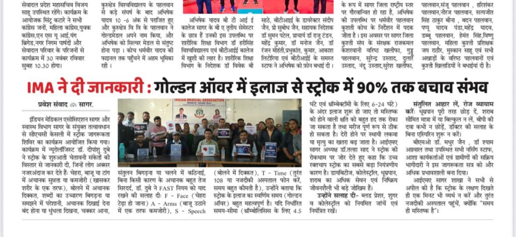 आईएमए सागर शाखा ने सभी से अपील की है कि स्ट्रोक के लक्षण दिखते ही एक मिनट भी व्यर्थ न करें और तुरंत नजदीकी अस्पताल पहुंचें, क्योंकि “समय ही मस्तिष्क है”।