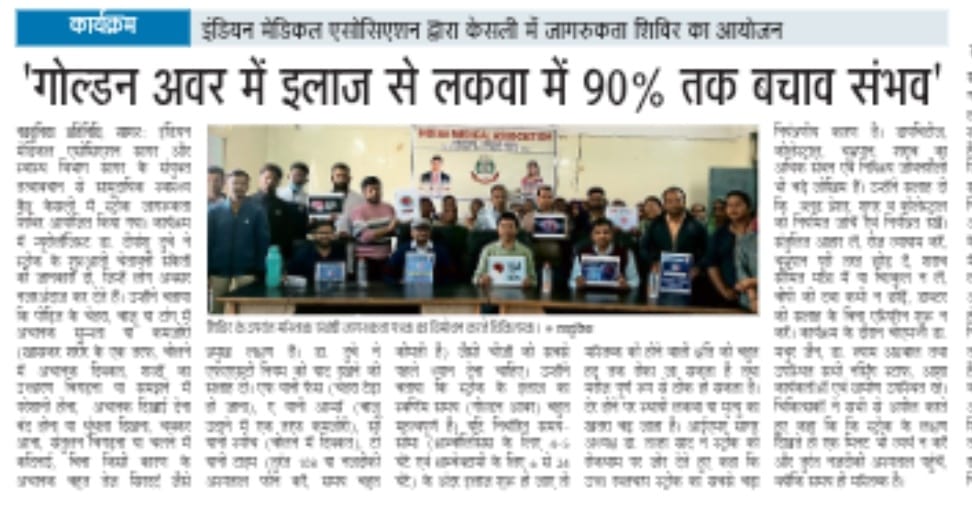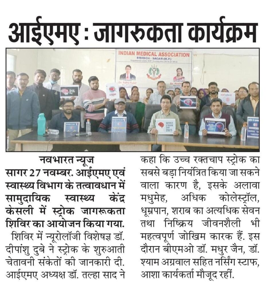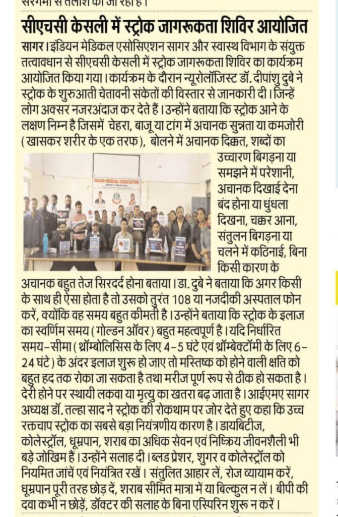 इंडियन मेडिकल एसोसिएशन सागर और स्वास्थ विभाग सागर के संयुक्त तत्वावधान से सीएचसी केसली में स्ट्रोक जागरूकता शिविर का कार्यक्रम आयोजित किया गया।