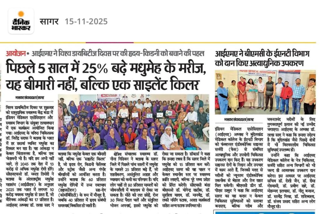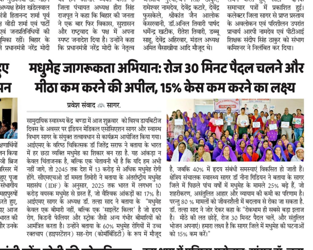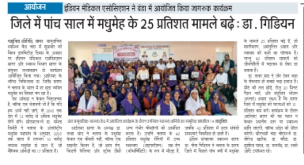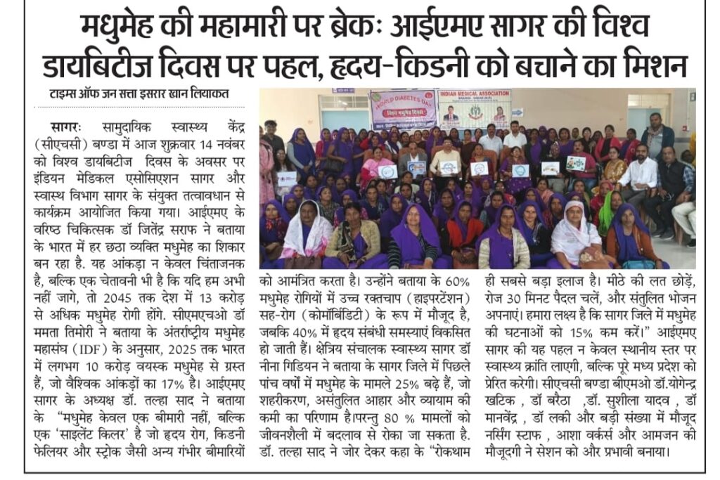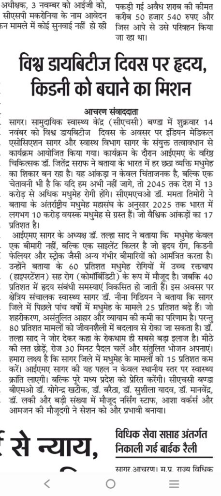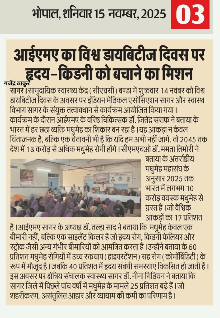 सागर, मध्य प्रदेश, 14 नवंबर 2025 –सामुदायिक स्वास्थ्य केंद्र (सीएचसी) बण्डा में आज शुक्रवार 14 नवंबर को विश्व डायबिटीज दिवस के अवसर पर इंडियन मेडिकल एसोसिएशन सागर और स्वास्थ विभाग सागर के संयुक्त तत्वावधान से कार्यक्रम आयोजित किया गया।
