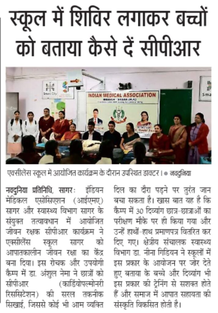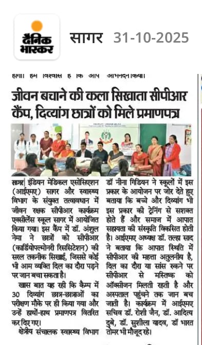 सागर, 30 अक्टूबर 2025 – इंडियन मेडिकल एसोसिएशन (आईएमए) सागर और स्वास्थ्य विभाग सागर के संयुक्त तत्वावधान में आयोजित जीवन रक्षक सीपीआर कार्यक्रम ने आज एक्सीलेंस स्कूल सागर को आपातकालीन जीवन रक्षा का केंद्र बना दिया! इस रोचक और उपयोगी कैम्प में डॉ. अंशुल नेमा ने छात्रों को सीपीआर (कार्डियोपल्मोनरी रिससिटेशन) की सरल तकनीक सिखाई, जिससे कोई भी आम व्यक्ति दिल का दौरा पड़ने पर तुरंत जान बचा सकता है।