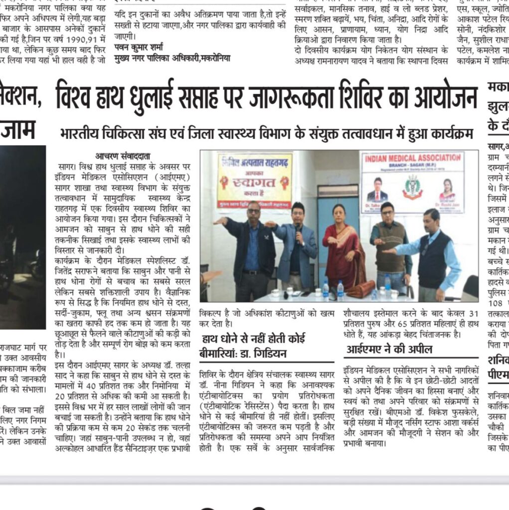 विश्व हाथ धुलाई सप्ताह के अवसर पर इंडियन मेडिकल एसोसिएशन (IMA) सागर शाखा तथा स्वास्थ्य विभाग सागर के संयुक्त तत्वावधान में सामुदायिक  स्वास्थ्य केंद्र, राहतगढ़ में एक दिवसीय मेगा स्वास्थ्य शिविर का आयोजन किया गया।